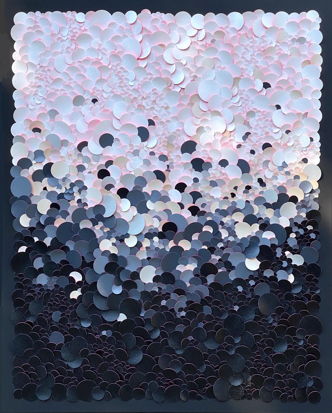 Je fabrique et j’assemble des éléments par collage avec la seule intention de mettre en valeur la réflexion des couleurs. La technique est mixte juxtaposant la peinture et le papier préalablement travaillé. La lumière m’accompagne dans ce processus de montage et m’aide à développer une improbable palette de reflets colorés. Cet écho se rajoute à l’ombre et à la lumière.
