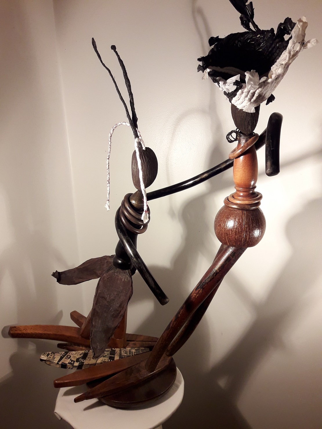Éléments créés puis assemblés pour façonner des chefs d’œuvre de fonctionnalité ou pas, au temps de vie compté, rythmé par l’éternelle ronde de la mode qui en restreint la durée de paraître. Aussi , quand je rencontre définitivement oublié sur le bord d’un trottoir ce pauvre mobilier , õ combien riche des éléments qui le composent, je délie les assemblages de sa constitution originelle et les marie autrement pour donner un instantané de vie en marche. Ainsi nouvellement réunis, les membres délicats offrent au regardeur une compagnie de corps dansant, qui d’un pied serein ponctuent l’espace.