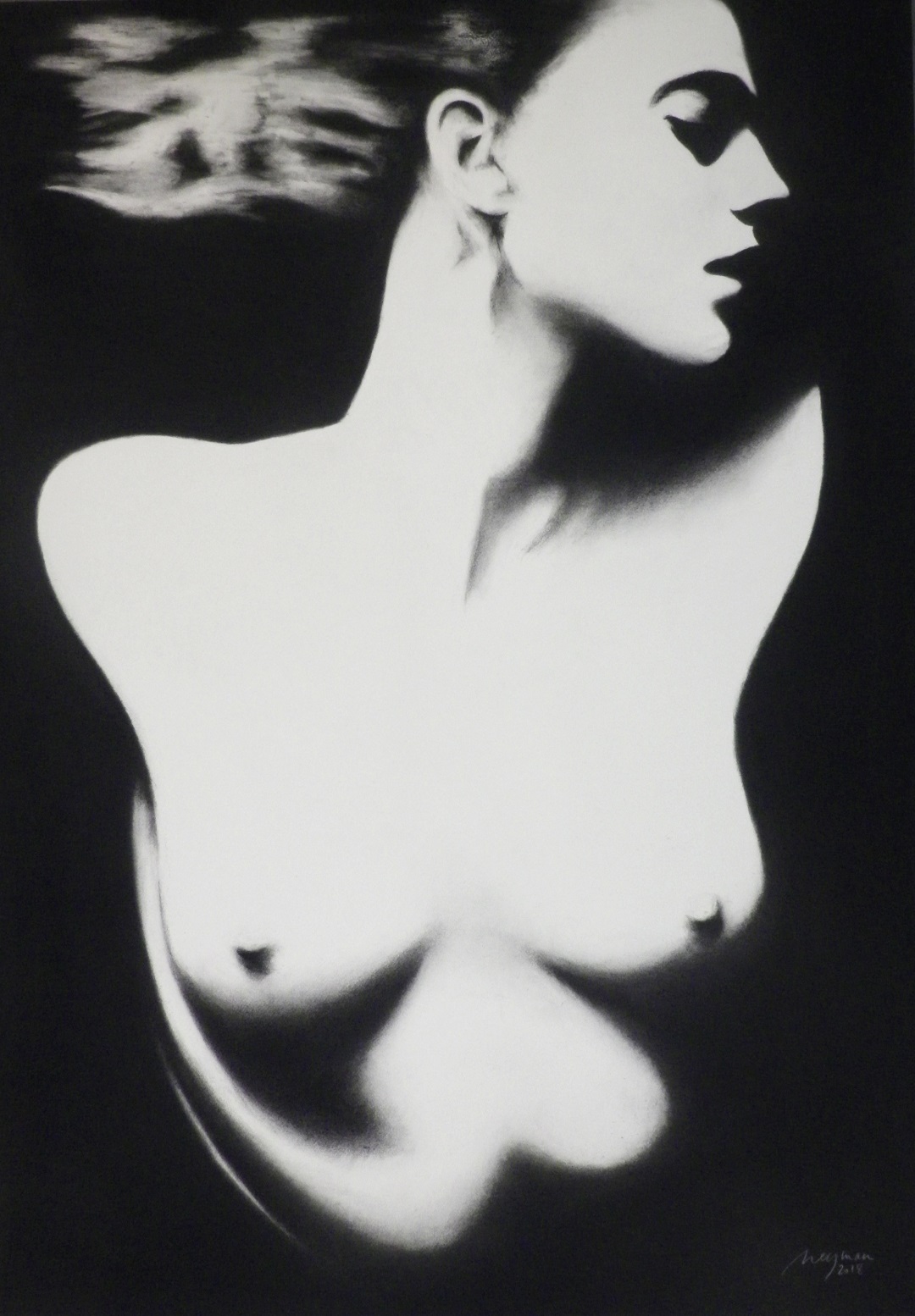 La force du pastel réside, a priori, dans la couleur. Dans les dessins de Nicolas Neyman, elle se trouve donc ailleurs. En ne travaillant quasiment que le noir, il détourne le médium de sa puissance première, réduit sa palette au maximum et, paradoxalement, en supprimant la couleur apporte au pastel force et modernité. Ultime paradoxe : en s’approchant de la photographie, les dessins de Nicolas restent très éloignés de toute forme d’hyperréalisme. Le figuratif, c’est de la forme. La forme, c’est de l’abstrait. Oubliez alors le noir du dessin, regardez les blancs qui se forment. Et si, finalement, ces visages, ces corps, n’étaient pas si éloignés de l’abstraction ?
