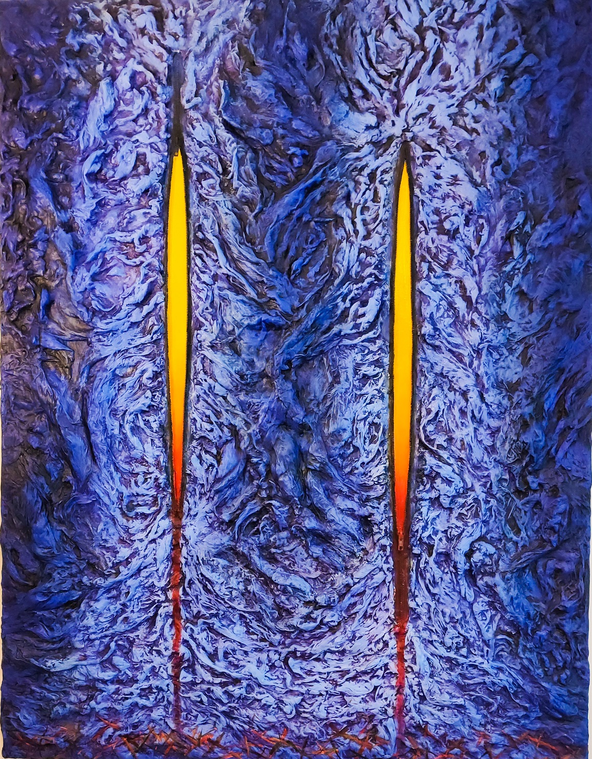 L’artiste s’interroge sur la problématique de la structure de l’espace intérieur et extérieur de l’artiste. Elle travaille sur le dévoilement, l’introspection, l’être et le paraître. Elle inscrit cette recherche en des œuvres colorées et vibrantes. Elle couvre ses œuvres de strates de matière, fendues par des fermetures à glissière, ouvertes sur un nouvel espace pictural intérieur, révélé et mystérieux.