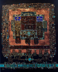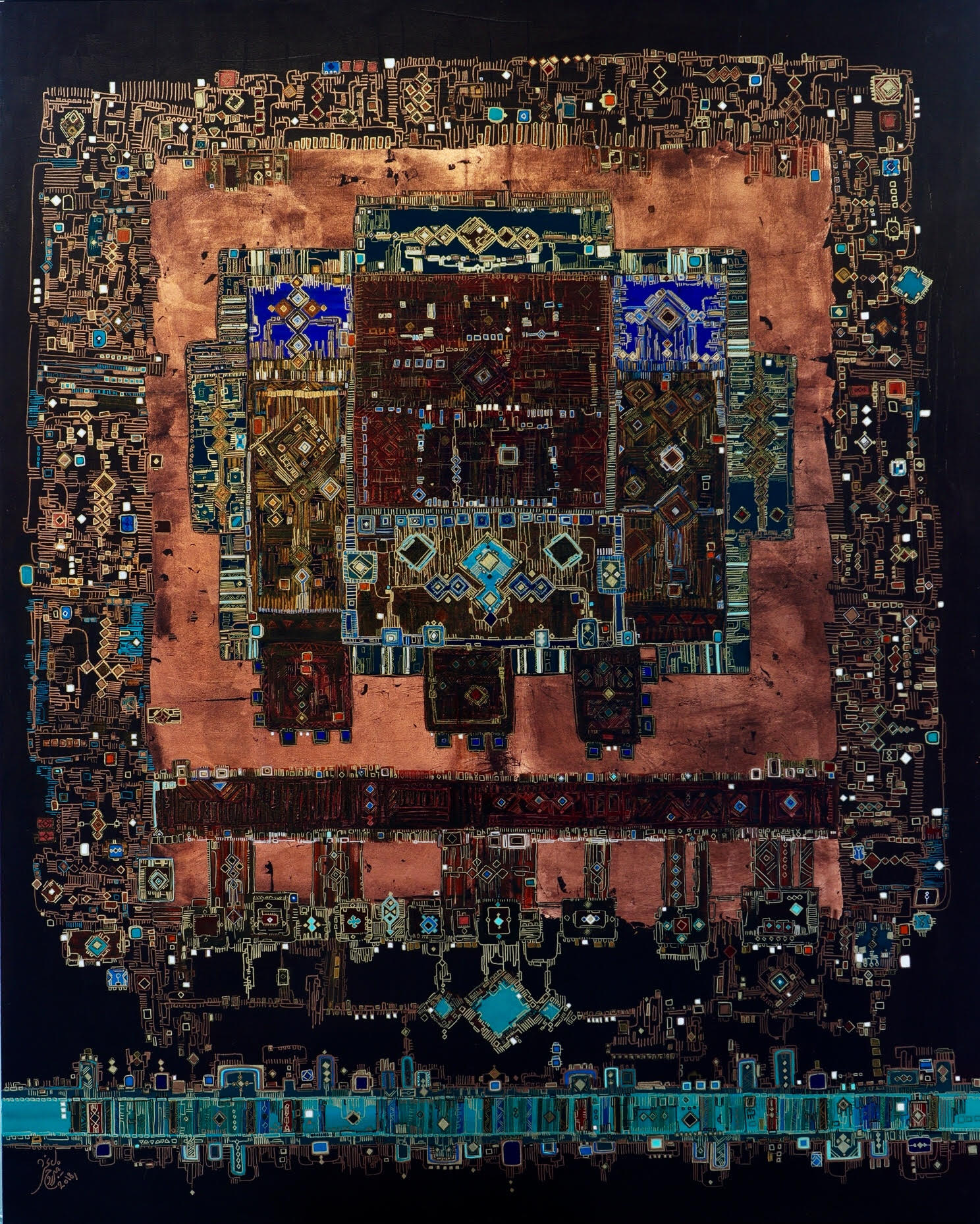 C’est une double impression sur la rétine que produisent les œuvres de Negin Rouhbakhsh lorsqu’elles sont exposées au regard du public. Il y a tout d’abord l’évidence de l’héritage culturel persan qui saute aux yeux lorsque l’on regarde pour la première fois un tableau de Negin Rouhbakhsh. La vivacité des couleurs, la complexité des motifs, les entrelacs infinis que dessinent les lignes sur la surface de la toile évoquent sans ambigüité l’art du tapis et de la mosaïque persans, savoirs millénaires transmis de génération en génération. Mais il y aussi, à bien y regarder, une contemporanéité de l’œuvre de Negin Rouhbakhsh, qui la relie à la fois à l’art abstrait de la deuxième moitié du 20ème siècle mais aussi aux puces électroniques que l’on trouve sur les cartes mères d’ordinateur, ces circuits imprimés qui assurent la liaison de tous les composants et permettent aux microprocesseurs de les reconnaître.