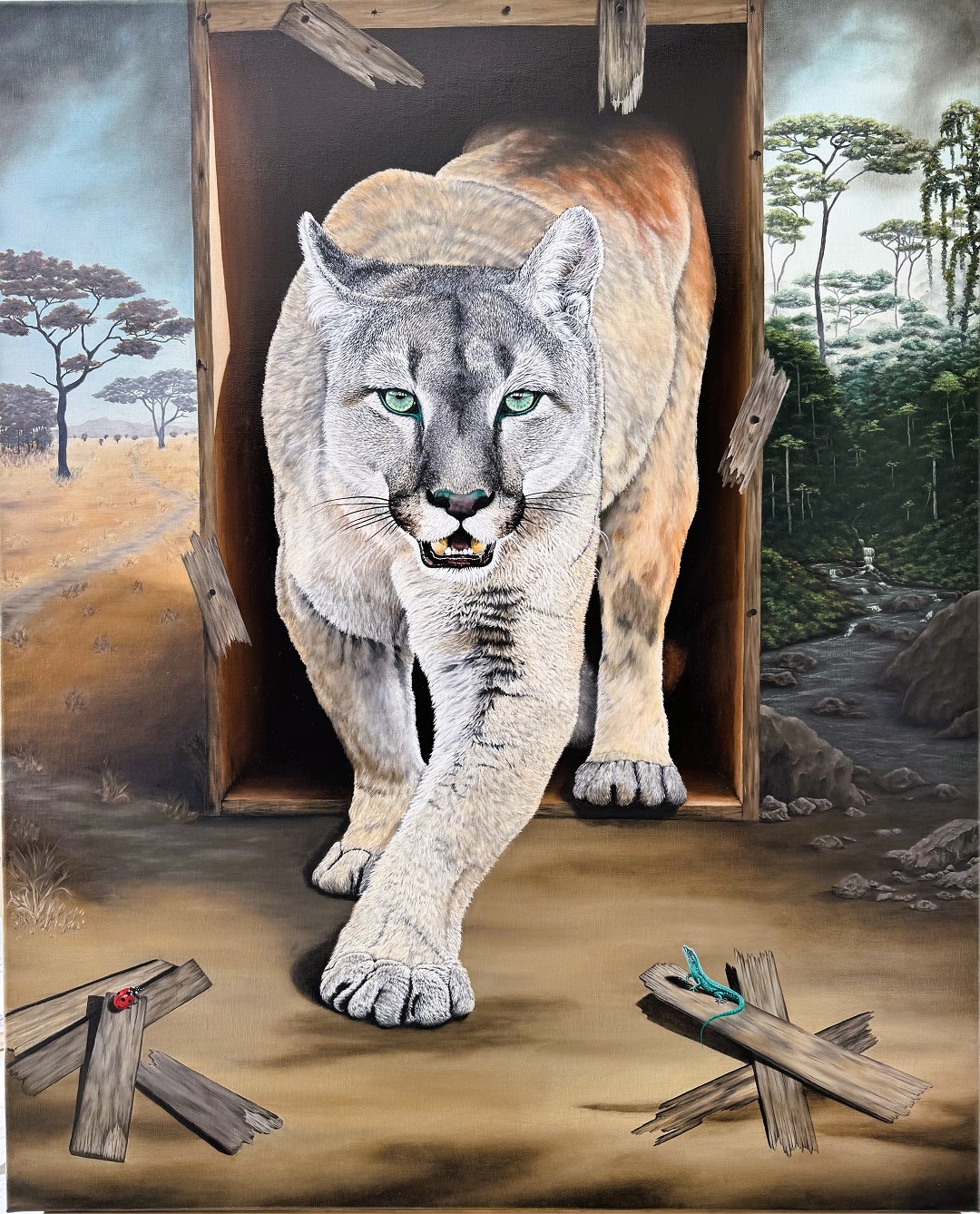 Alias Salamandre. Autodidacte, je dessine et peins à l’huile depuis mes 13 ans, peignant pendant longtemps pour mon plaisir et surtout pour un besoins viscéral source de mon équilibre. J’ai commencé à exposer très tardivement. Très influencée par le surréalisme, ma peinture est à l’huile sur toile, style symbolico-poético- hyperréaliste et profondément engagée pour la nature. Mon message le plus important est que nous faisons partie de cette nature qui nous apporte la sérénité et que nous devons protéger et écouter. J’aime détourner les objets, des éléments de la nature pour que le spectateur puisse en imaginer la suite, ou suivre ses émotions personnelles et rêver….