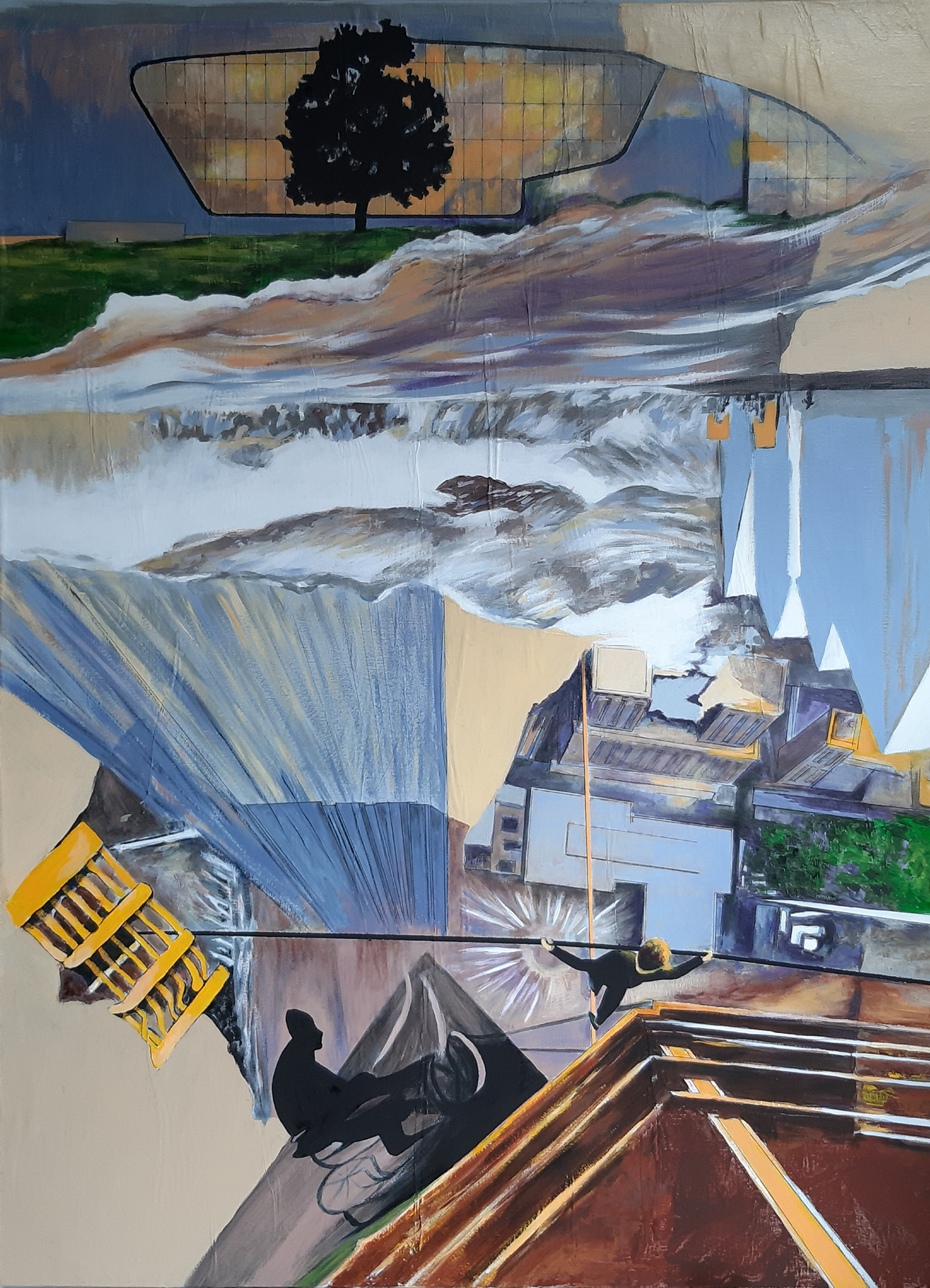 Ainsi, quand son geste devient la trace du passage d’un être ou d’une action, la toile pour elle commence à faire sens. Pour accompagner cette dynamique, l’artiste mêle différents médiums, [pour « le Passage en Tarlatane » , acrylique et fusain sur toile ] où la spontanéité du geste sous tendue par un équilibre construit, questionne avec fougue le rapprochement entre l’art et la vie